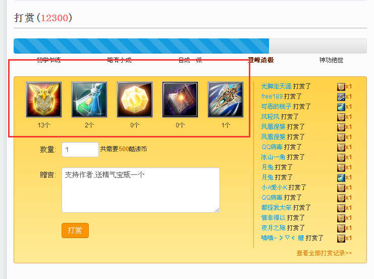 好书嘛,当然要给予奖励啦~是对作者的鼓励和支持哦,下面是打赏流程啦!选择你要送出的宝物和数量 点击打赏就送出去拉!